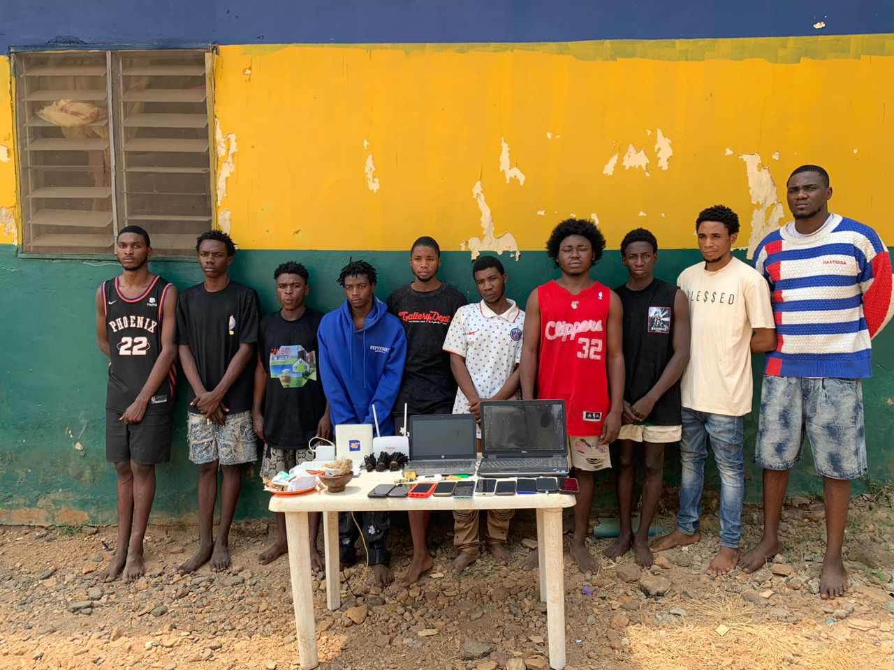 “During the operation, Ten (10) suspects were arrested, and the following items were recovered from them as exhibits: two (2) Laptops, ten(10) sophisticated mobile phones of different brands, three (3) WIFI routers, criminal charms, black soap, hard drugs (Loud weed and dried leaves suspected to be marijuana), etc”.