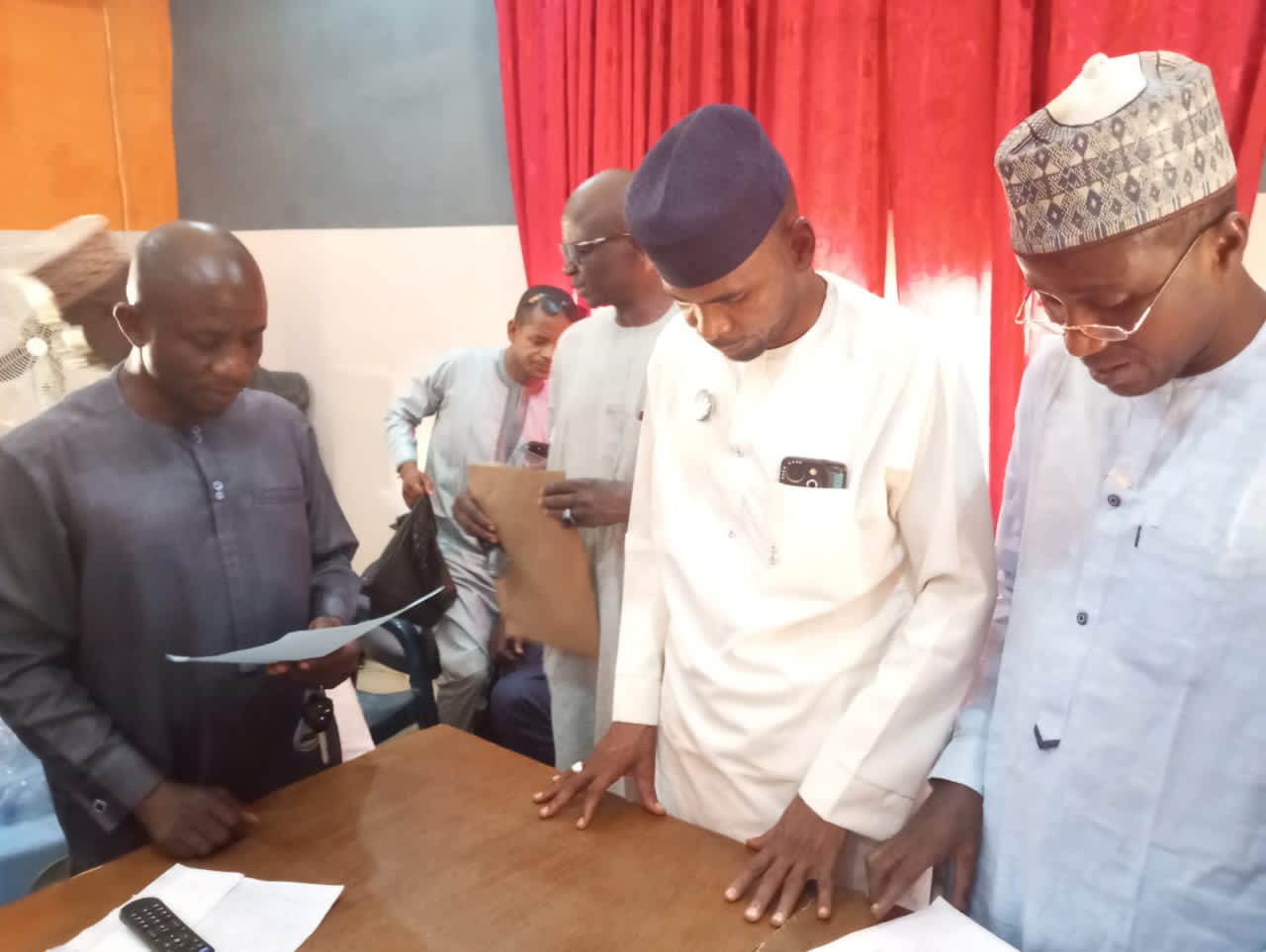 (Left) the newly elected chairman of Sokoto Correspondents' Chapel, Ankeli Emmanuel taking oath of office at the State NUJ Secretariat today.